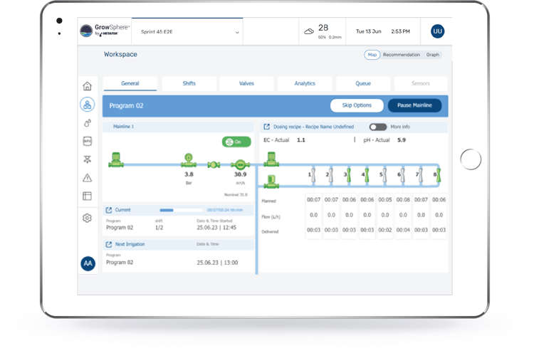 GrowSphere™ MAX te permite gestionar incluso las tareas de riego y fertirrigación más complejas, ofreciendo el máximo rendimiento con el mínimo esfuerzo. Desde la ejecución automatizada y la validación de comandos hasta informes detallados, es el socio versátil perfecto para cualquier finca.